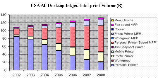 2004年11月15日InfoTrends研究機(jī)構(gòu)發(fā)表的市場調(diào)查結(jié)果表明,2003年美國共安裝了超過8300萬臺桌面噴墨打印設(shè)備,使得噴墨成為桌面打印的主要輸出方式。其中,照片噴墨打印機(jī)裝機(jī)量482萬臺,比02年增加39%。在這里所謂照片打印機(jī)(Photo Printer),是指同時(shí)具備照片級彩色輸出性能,數(shù)碼相機(jī)存儲卡插槽,照片級墨盒三種典型特征的打印機(jī)。多功能一體機(jī)(MFP, multifunctional printers or imaging devices)是將打印,掃描,傳真,復(fù)印等功能復(fù)合一體的設(shè)備,其增長的速度也非常快,2003年裝機(jī)量1585萬臺,比02年的1085萬臺增長46%。其中部分MFP除打印,掃描,傳真功能外,還具備照片彩色打印功能,這種增長同時(shí)也大大提高了特殊打印介質(zhì)(specialty media)的需求。Infotrends預(yù)期到08年,照片噴墨打印機(jī)的年裝機(jī)量可達(dá)1890萬臺,占總裝機(jī)量的18%,普通MFP高達(dá)4800萬臺,占總裝機(jī)量的45%,帶照片彩色打印功能的MFP1160萬臺,占總裝機(jī)量的11%。而普通型個(gè)人噴墨打印機(jī)(Personal Pinter)的裝機(jī)量呈逐年下降趨勢,數(shù)據(jù)表明2003年比02年下降了4.3%,普通個(gè)人噴墨打印機(jī)所占比例也逐年減少,預(yù)期08年僅占15%以下。2003-2008年間,噴墨打印機(jī)的總裝機(jī)量CAGR 為5%。